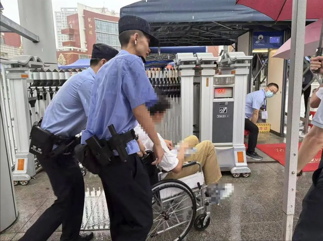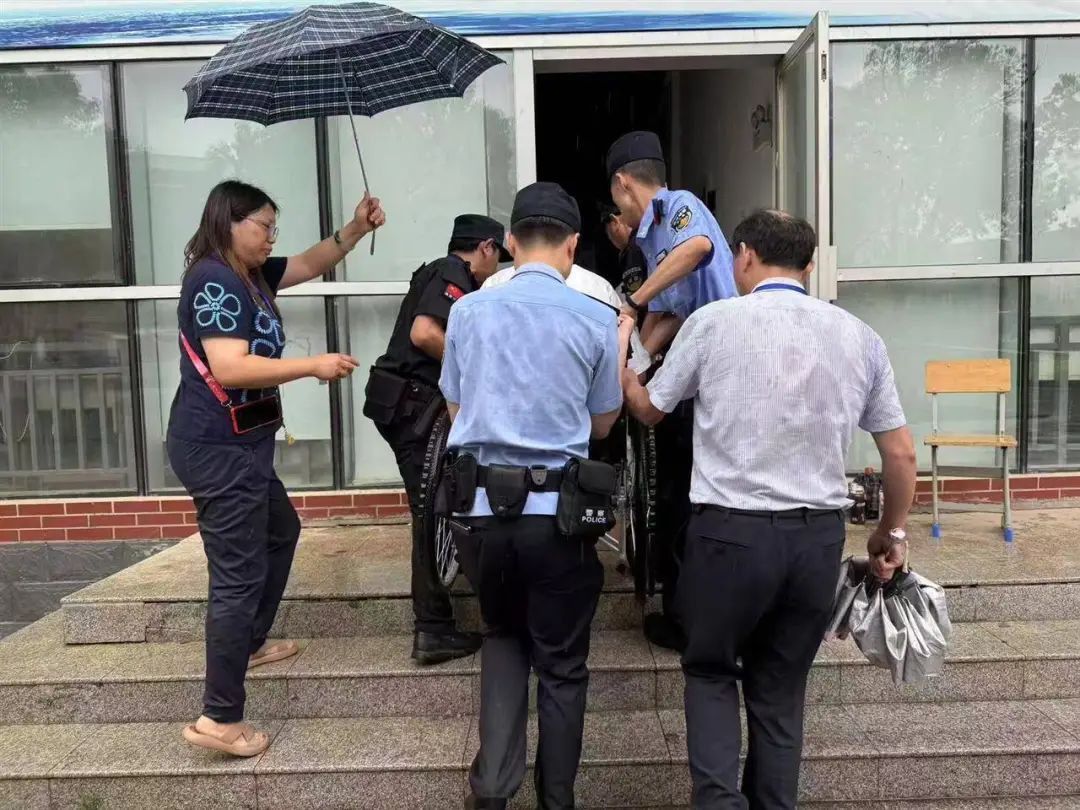 此时外面雨势渐大,民警张修睿随即带领在场辅警游鹏、管玉龙、程实,四人合力用轮椅护送考生前往考场教室。一路上,民警不断鼓励考生“别担心”。考生虽身体虚弱,但感激地说道:“谢谢警察叔叔!”